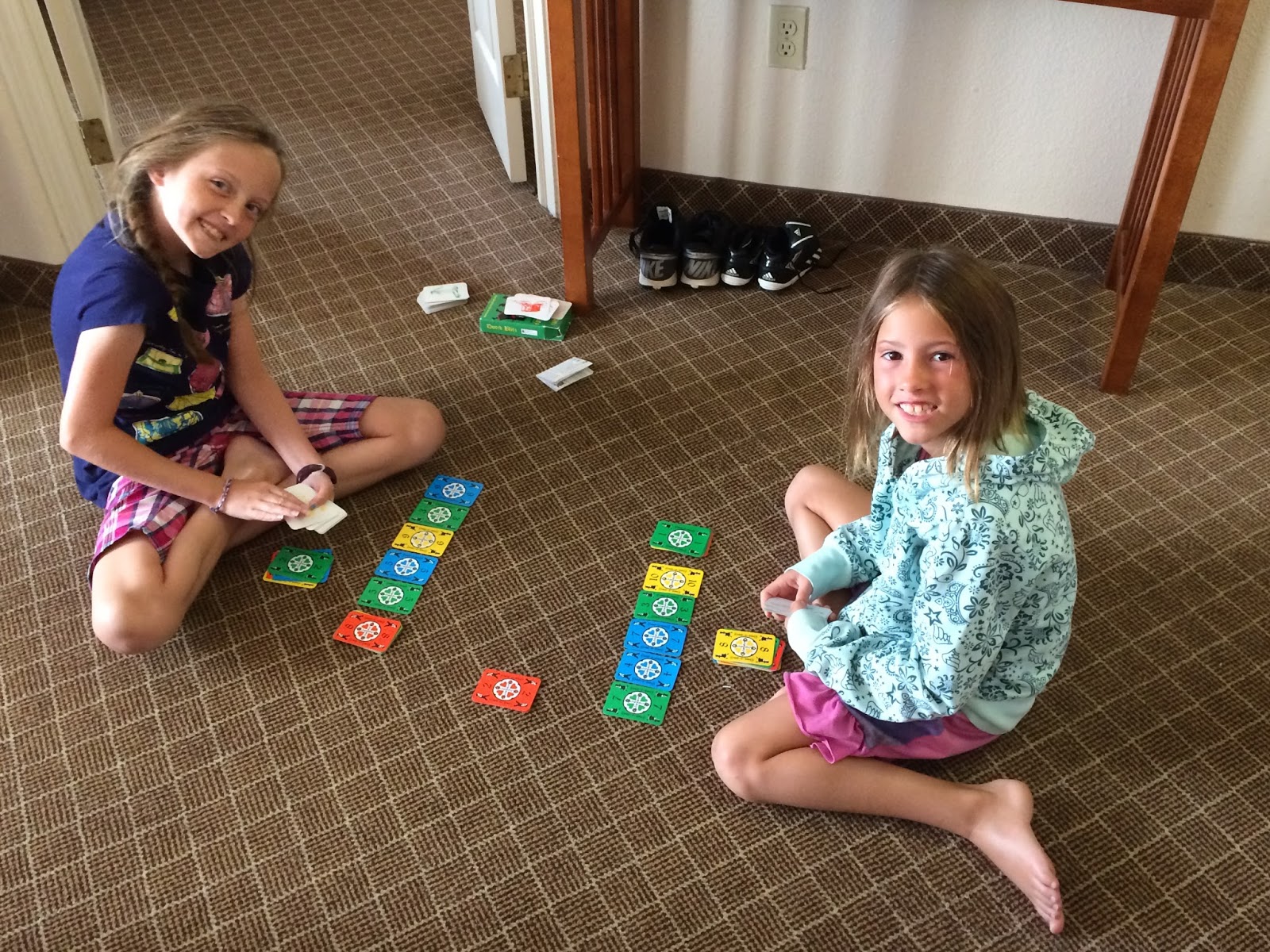 Back at home – new coffee tables for the family room! We haven’t had a coffee table for over 10 years. When we first got married we bought a glass one, but after it broke a few years later we decided not to replace it because we had always been moving it out of the way to play or wrestle or tackle or sword fight or do somersaults, etc. We realized we valued the open carpet space over a table for that stage with our kids. Anyway, now that they are older and getting too big to be so wild in the family room I thought we were probably ready for tables. You can tell by Cindy’s face that she was extra pleased to have such a perfect place to play with her magnet dolls.